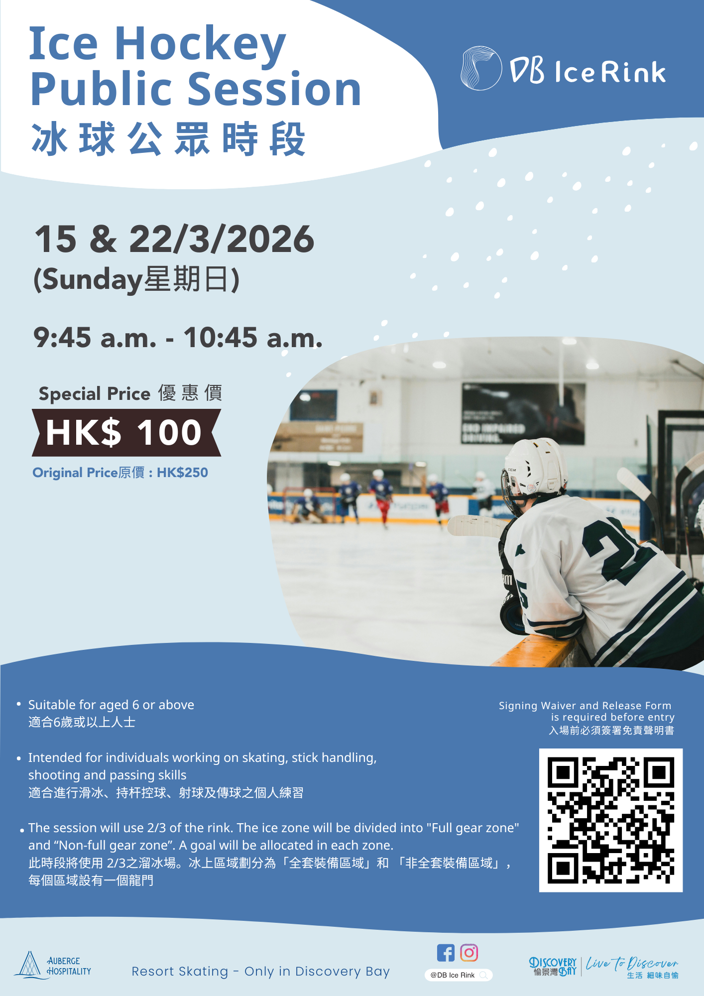 - No slapshots, body contact and lessons or training are allowed during Ice Hockey Public Session.